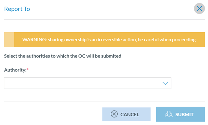 The Officer has to select as many Authorities as needed on the ‘Authority’ drop-down menu and click ‘Submit’. The report will be submitted to the chosen Authorities as an OR, and both the OC and the OR(s) will be linked, so when there is an update in the OC it will be propagated to the OR(s).