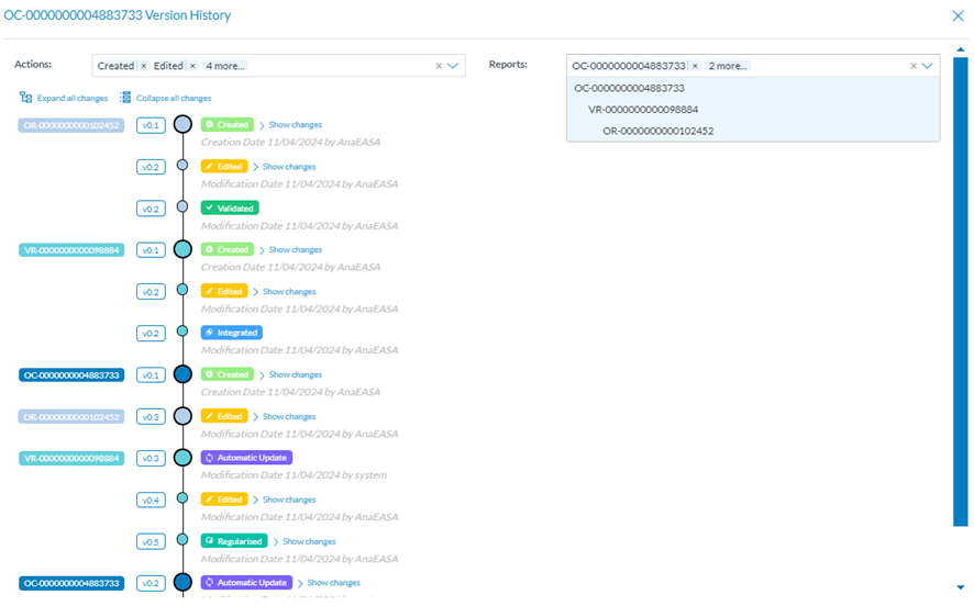 This option of the 3-dot menu of each OR, VR and OC shows a modal view with all the changes the report has been through, including modification dates and users and the changes in the attributes, if edited.