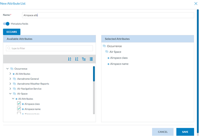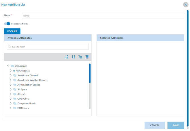 The Officer has to fill in the Name field that is unique to each Attribute List export profile. The metadata fields check is activated by default. The Officer can deactivate it so the metadata attributes of the selected reports will not be exported.