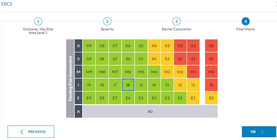 4. Final Matrix: The calculated risk grade is highlighted in the matrix with a tick icon and blue border. The Officer can change this value by clicking in another cell, and the system will add a field to make mandatory comments.