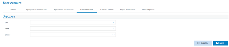 Views are used to display the information contained in a record, featuring varying numbers of attributes/entities, a specific design, and other custom elements. They enable certain users within organisations to concentrate on the elements relevant to their tasks. The fourth tab of the ‘My Account’ menu opens the ‘Favourite Views’: