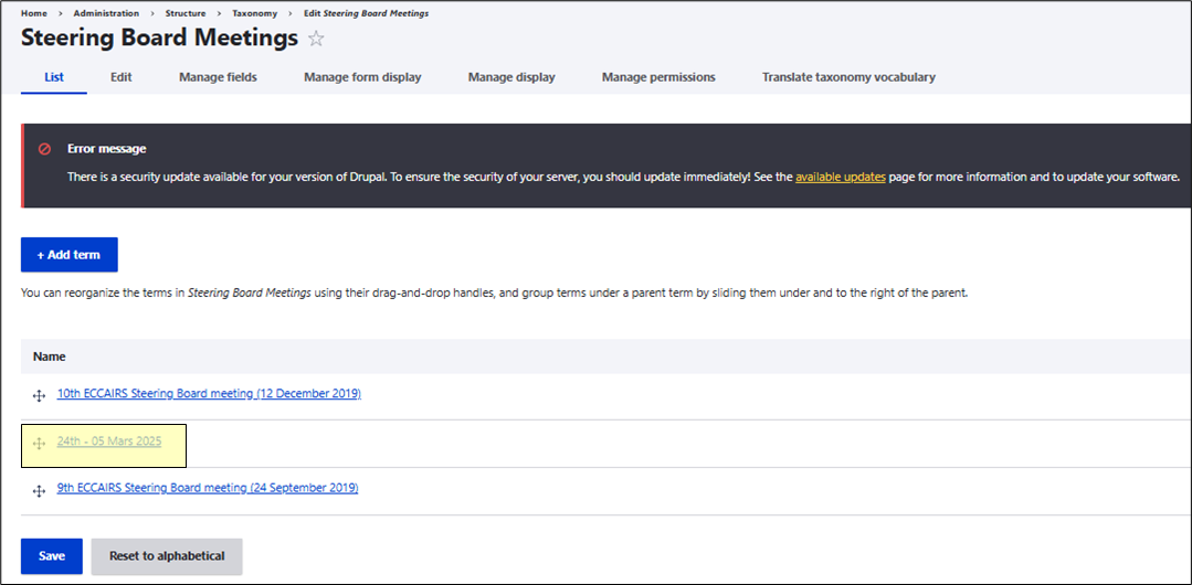 3.2. In the Taxonomy page, select “Add terms” for the desired menu (for example, Steering Board Meetings).