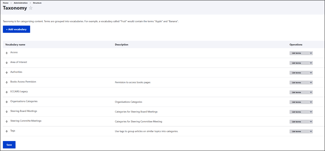 4.5. If desired, the folders files that the menu contains can be listed from the Structure > Taxonomy page. For example, for the Steeing Board Meetings, select “List terms” and later the folder previously created.