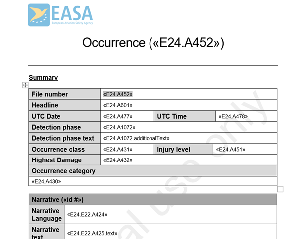 Officers use Word Templates in ECCAIRS2 to export reports in Word format. The Word template has to include the complete path of the Attributes according to the Authority’s released Taxonomy so that the system can fill each template field with the Attribute's corresponding value in the report.