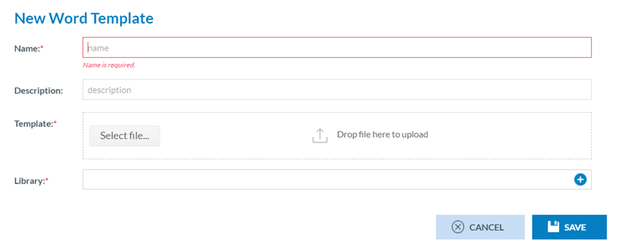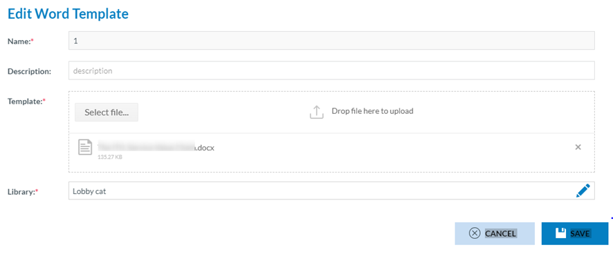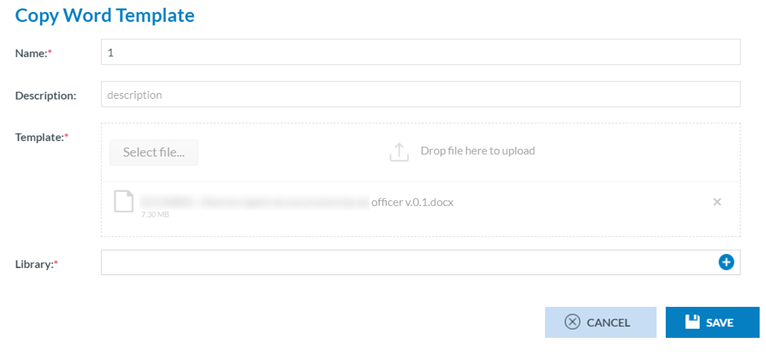 The Administrator has to fill in the Name that has to be different from the existing ones, upload the needed word file to the Template section through the ‘Select file’ button or drag and drop it to the section and select a Library, a category or a subcategory.