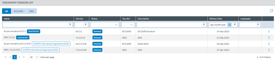 National Security Administrators can filter ‘All’, ECCAIRS and SRIs Taxonomies through the tabs displayed above the table.