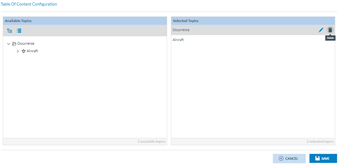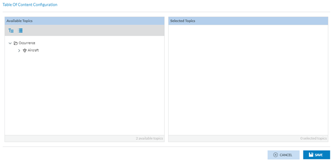 When the Table of Contents is selected, a configuration icon is displayed next to this tab. Administrators have to click on it, and the system will display the Table of Content Configuration window: