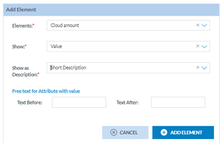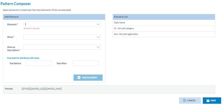 Select and configure an Element (Show and Show as Description mandatory drop-down menus). Click on the 'Add element' button to add it to the Pattern Composer: