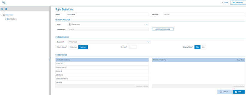 · On the right side, there is the Topic definition for ‘Occurrence’ (‘Recommendation’ for SRIS-based views) or the added topic in the Topic tree (see next section for further detail)