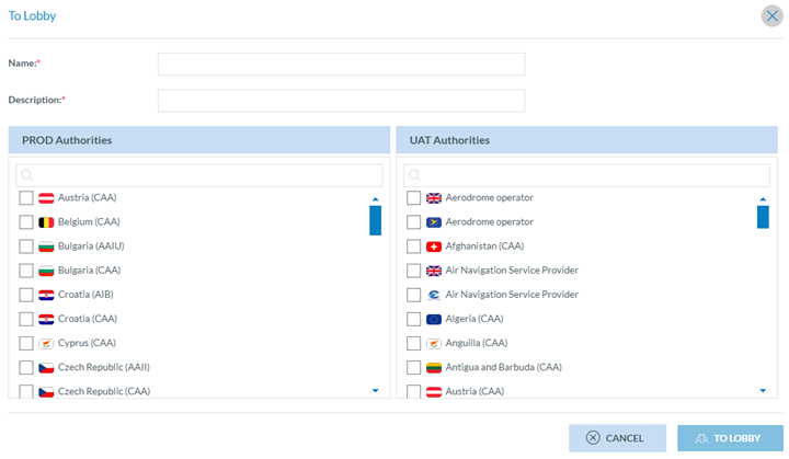 Administrators must fill in the Name and Description fields and select the Authorities of the specific environments. Then, they have to click on ‘To Lobby’.