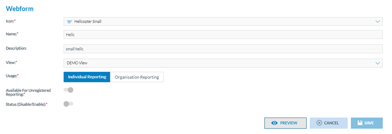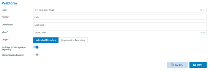 · Status toggle: by default, it is disabled. If activated, it is enabled so when the webform is saved. The webform will be available in the E2 Reporting Portal to report ORs