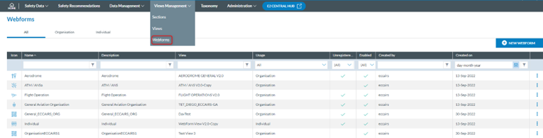 Administrators can create, edit, view, publish and unpublish their views, and regarding ECCAIRS webforms, they can view, enable and disable them. Webforms cannot be deleted.