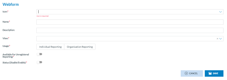 · Available for Unregistered Reporting toggle: deactivated by default. If activated, the webform will be available for non-registered reporters of the E2 Reporting Portal.