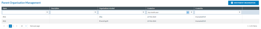 Above the table, the system provides the ‘New Parent Organisation’ button.