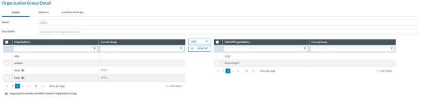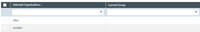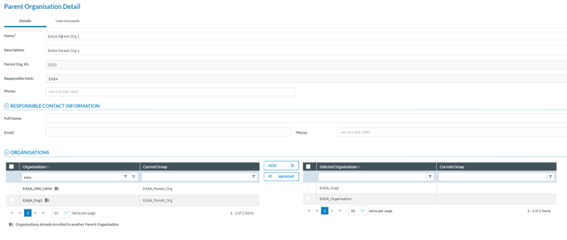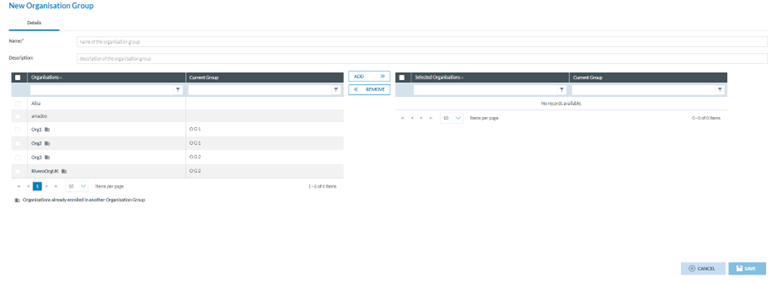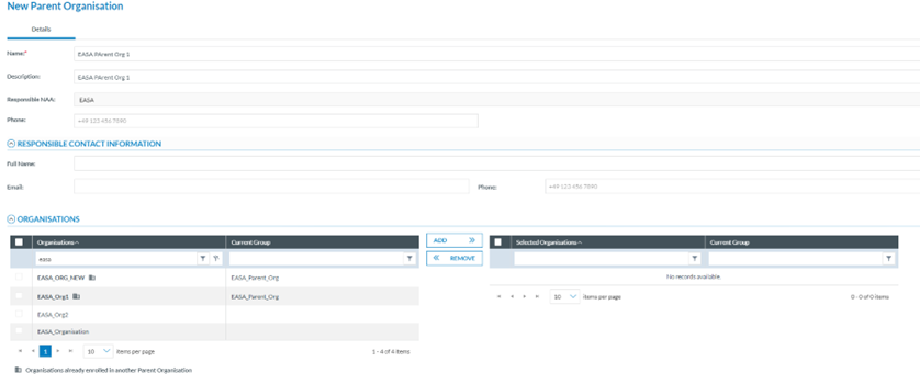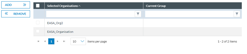 To create a parent organisation with associated organisations, apart from filling in the name, Administrators have to select through the check box the organisation/s needed, click on the ADD button, and they will be transferred to the table of selected organisations: