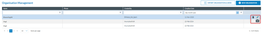 o The Organisation. Organisations associated with another parent organisation display an icon next to their name on the table.