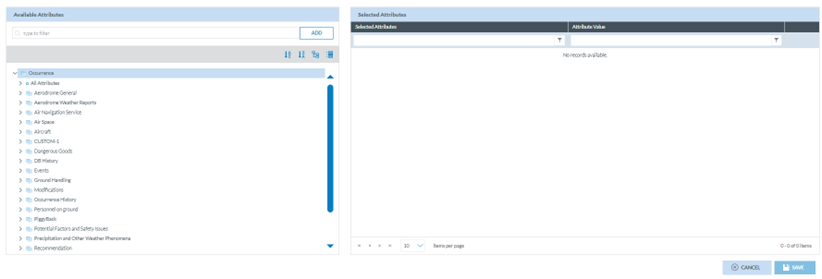 Through this page, the Administrator can select the Attributes available in the lists of ORs, VRs, OCs or SRs (according to the Authority type) in the corresponding ‘Safety Data’ or ‘Safety Recommendations’ menus of the Officers belonging to that Authority and the Attributes available in the landing page of the Reporting Portal for their reporters.