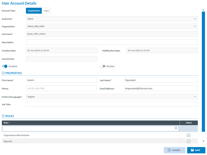 · Roles: by default, the system assigns the accounts created by Administrators to the Reporter organisation' Administrator role