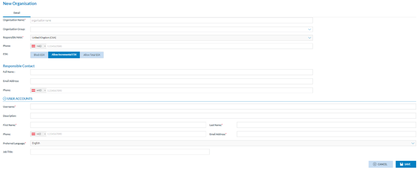 Administrators have to click on ‘New Organisation’ above the table of organisations, and the system will display the ‘New Organisation’ page: