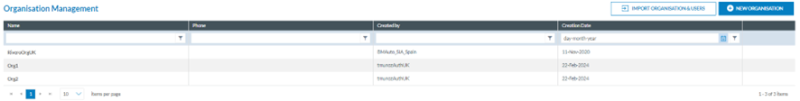 It displays a table of organisations with the following columns per Organisation row, which also work as filters: