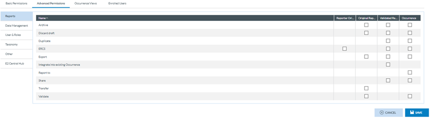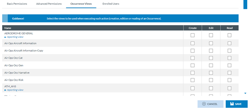 Occurrence Views: through this tab, Administrators can select the actions the users of this role can perform when using a particular View and save the selection. Otherwise, the role cannot be saved.