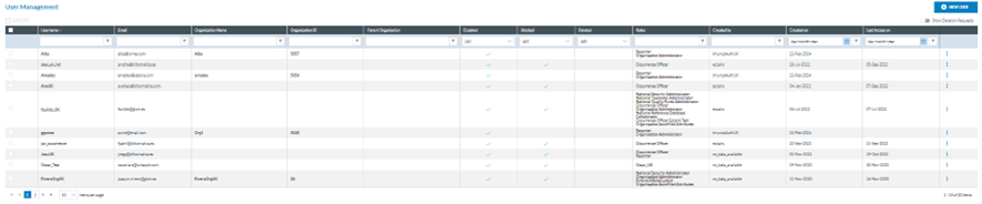 It displays the table of users, which includes the users created through this management and those created through the ‘Organisation Management’ option. See the section on Organisation Management for further details.