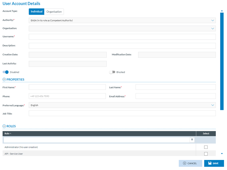 · Account Type: by default, it is Individual; Administrators can update it to Organisation