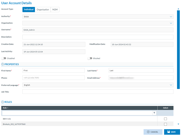 · Blocked toggle: by default, it is not enabled, and the account is not blocked. If enabled, the account is blocked