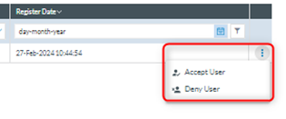 · Accept User: It accepts the user, and the user status turns to ‘Accepted’ in the request table. The system will send an email to the user through which to activate the account. The 3-dot menu will disappear from the specific request at the table.