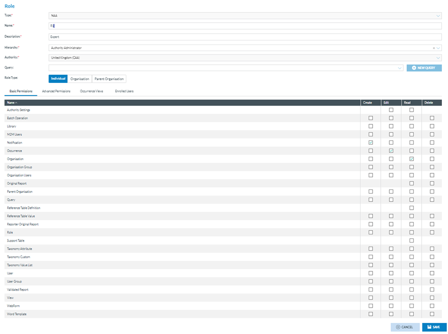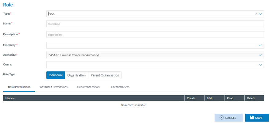Depending on the hierarchy selected on this menu, the Basic Permissions table displayed at the bottom of the page will be updated. Filling them is mandatory to save the role. For example: