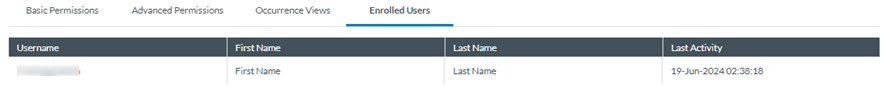 Note: The Users Enrolled tab is not editable. Through the Users management, Administrators can assign a role to a user, so this will be seen in the ‘Enrolled users tab’ of the Role page: