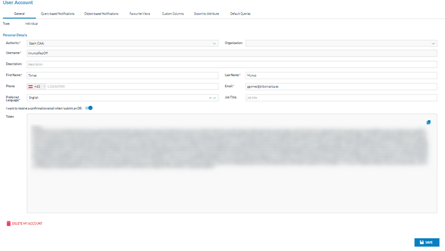 The first tab is ‘General’, indicating the type of account (individual or organisation) and the edit page for the personal details.
