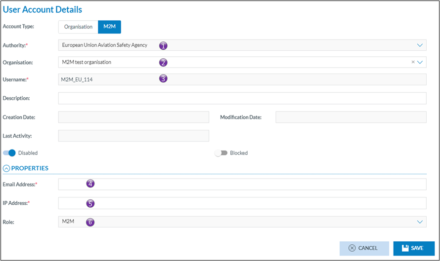 3. Is the username, the username is automatically generated by the system. It ensures that the username is unique throughout Eccairs2. As this is an automatically assigned username, that means, when creating a M2M user for the same organisation in another environment it will not be the same
