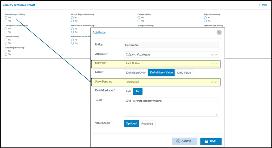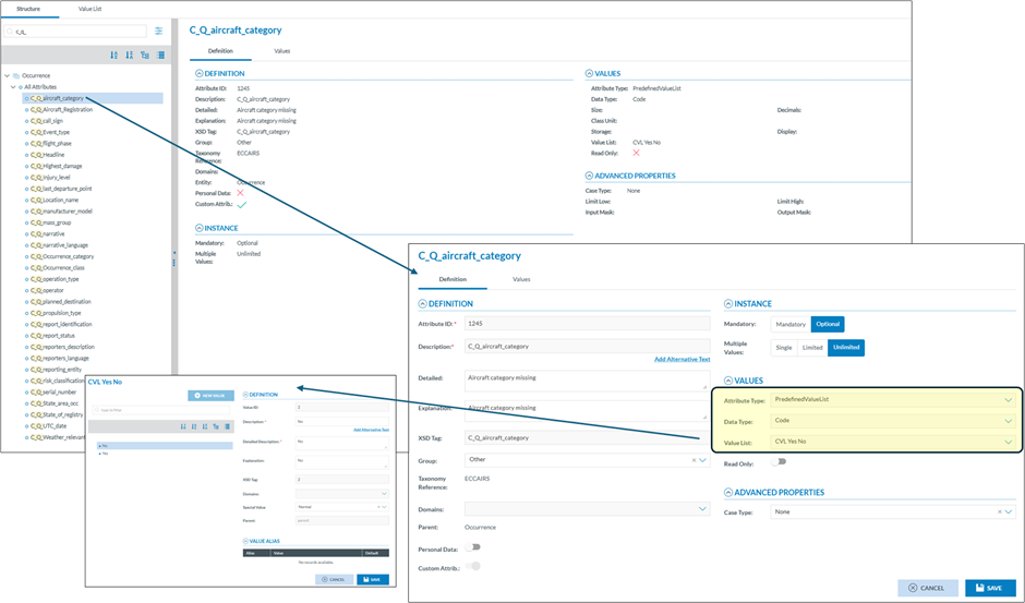 As a best practice, it is recommended to prefix custom attributes, as shown in the example above (e.g., “C_Q_aircraft_category”) which stands for C=Custom and Q=Quality