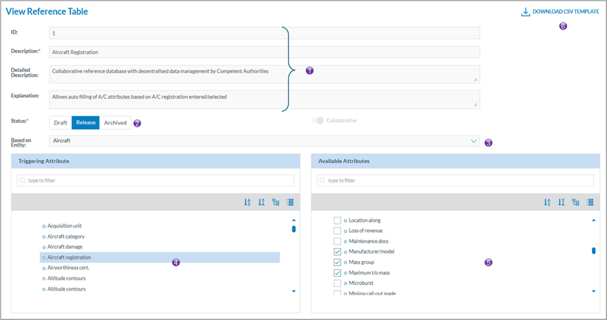 6. CSV Template Download. Provides a downloadable CSV template used for uploading data into the RefX database. The template includes both the triggering attribute (see point 4) and the checked attributes (see point 5).
