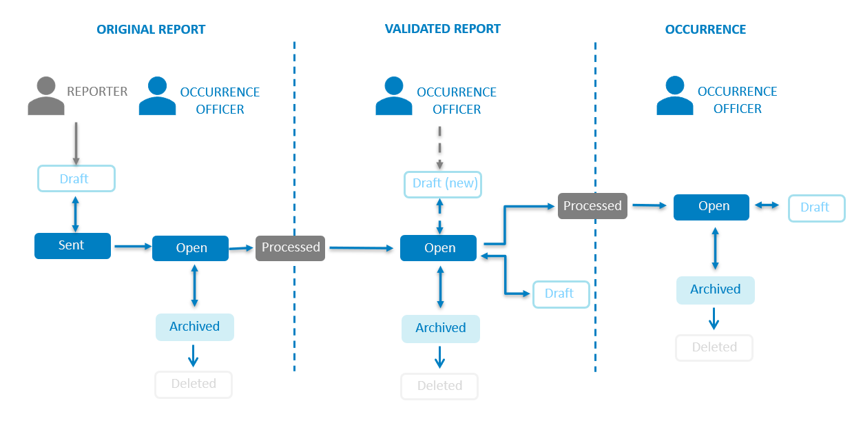 The following picture shows the status workflow of the Original Reports, Validated Reports, Occurrences; and how they are related to each other.
