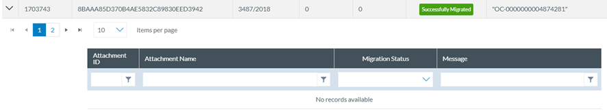 The right panel refers to the attachment and indicates if it exists, the total number, the number of successfully migrated ones, and the number of unmigrated attachments.