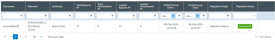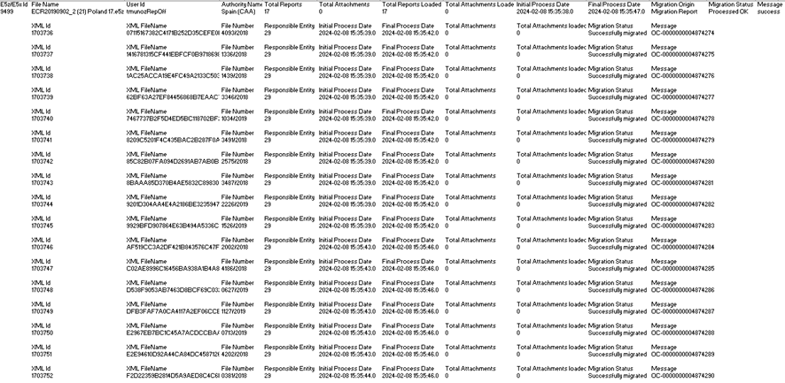 The download icon downloads an Excel file with the information of the migration results per XML of the E5Z file, i.e.: