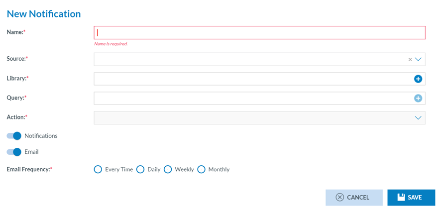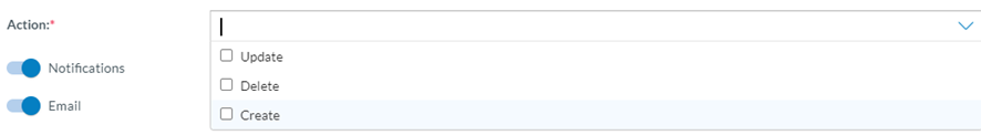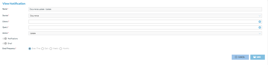 The fields are the same as in the ‘View notification’ of the previous section, but all the fields will be editable except the mandatory ‘Action’, which is only editable as soon as the source is selected in the previous field.