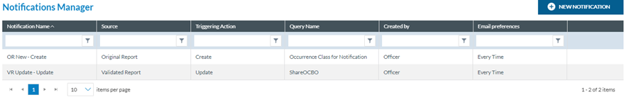 It displays the table of query-based notifications indicating per notification row the following columns that also work as filters: