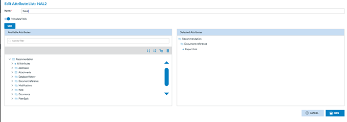 The Officer can update the Name, Metadata toggle or any of the selected attributes (drag and drop to change the order or remove from the right panel) and click ‘Save’, and the updates will be saved in the database. The table of Attributes lists will be updated accordingly.