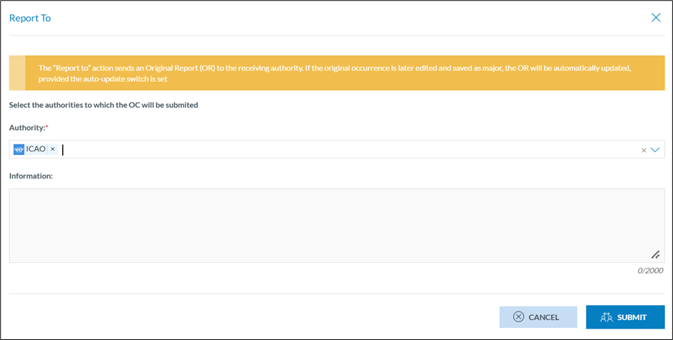 4. In the “Report to” interface, select ICAO in Authority field and click on SUBMIT: