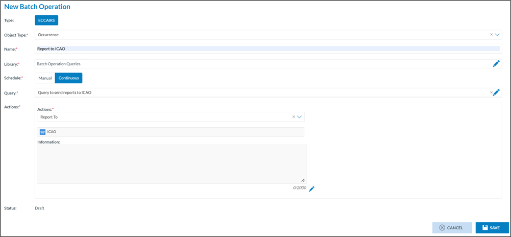 Filling out the interface with the necessary information, including the predefined query that collects the OC to be reported.