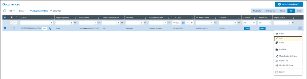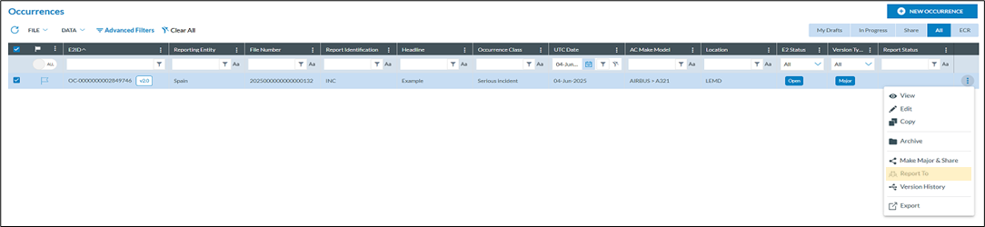 3. Via then kebab menu (three vertical dots), on the Occurrence list view, select “Report to”.