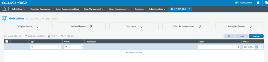 When the E2 System Administrator accesses the ECCAIRS2 Web Application or when navigating its sections and clicks on ‘Home’, the system displays the landing page: